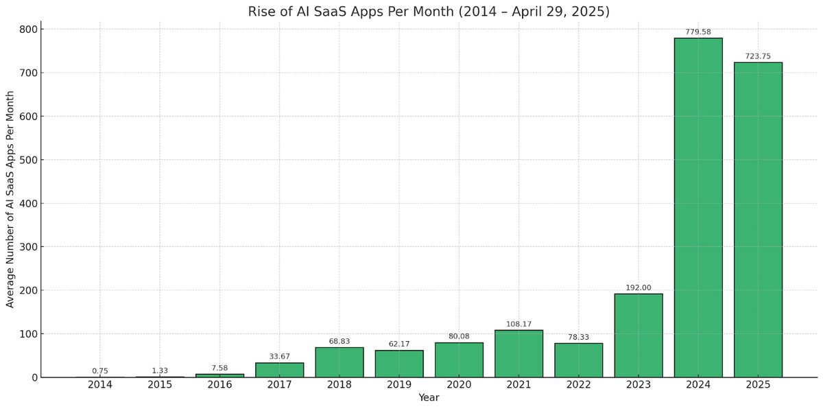 Fig. 1: Data from Saas Browser. The number of AI SaaS apps refers to websites classified as SaaS by our machine learning model. This means they use the .ai TLD (Top-Level Domain) and also display SaaS-like features, such as pricing pages, clear value propositions, a 'book a demo' feature, login, and more.
