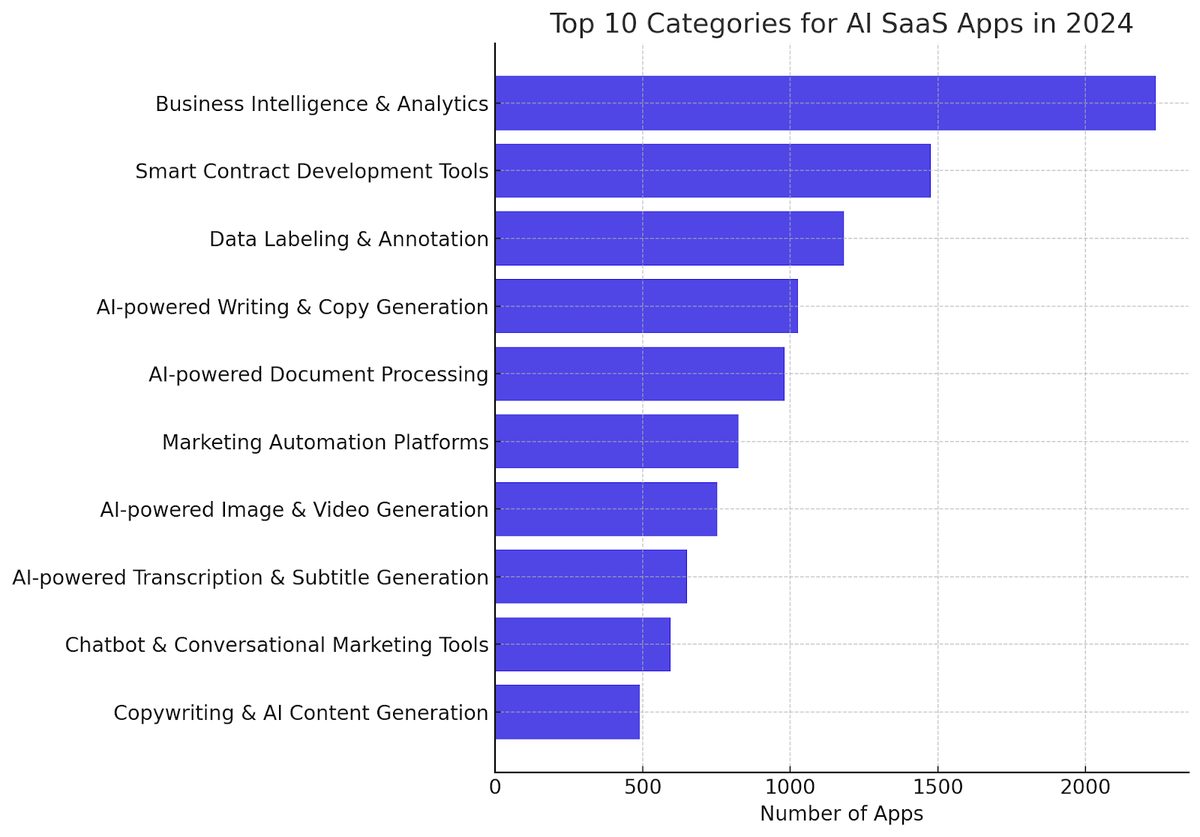 Drilling deeper into our data, we’ve highlighted the top ten categories for AI SaaS applications currently on the market in Fig. 2 below. Leading the pack in 2024 were Business Intelligence and Analytics apps with 2237 apps, followed by Smart Contract Development tools at 1476 and Data Labelling & Annotation with 1183.