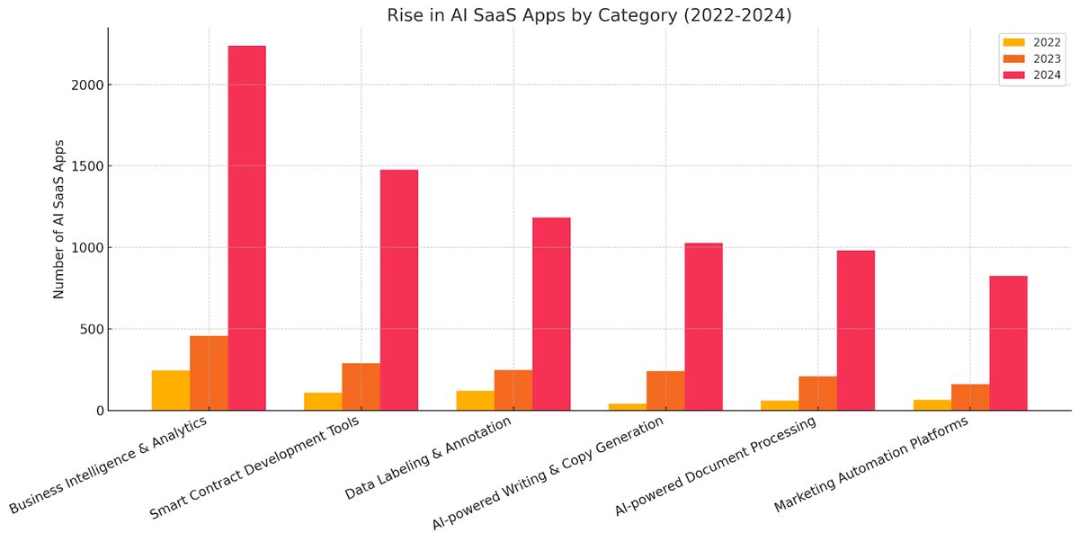 AI-powered Document Processing apps grew 1535% from 2022 to 2024, while AI-powered Writing & Copy Generation showed 2465% growth.