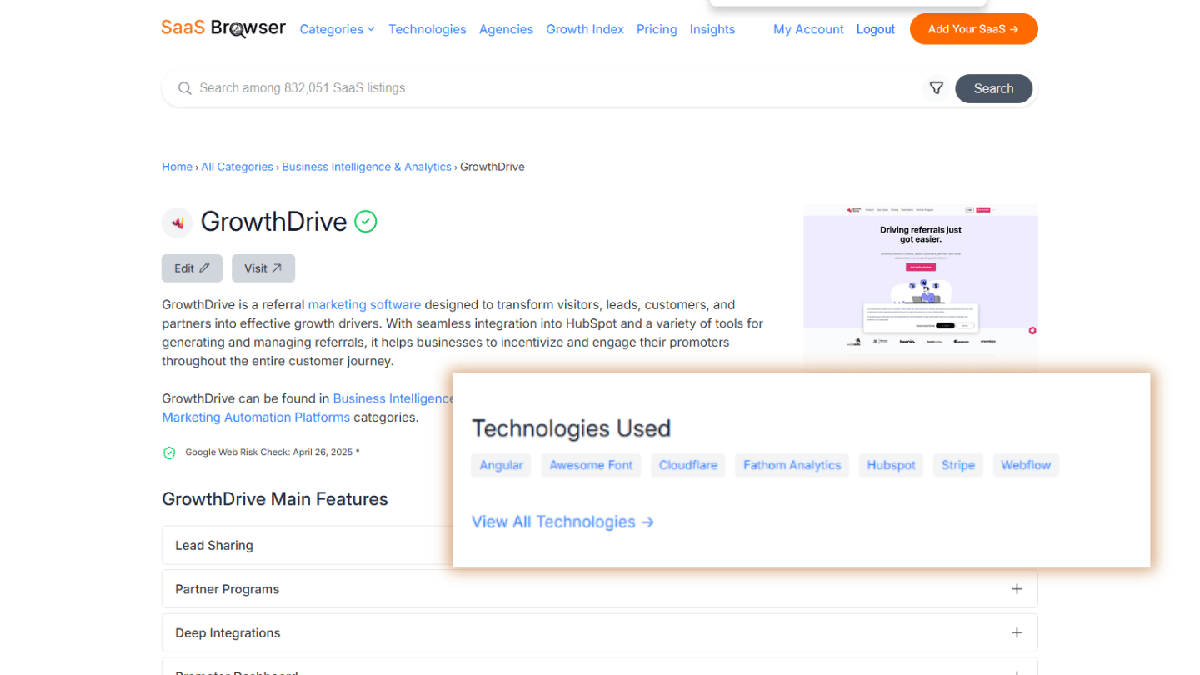With SaaS Browser, you can see positioning and audience fit on the SaaS profile itself. Each product listing includes: